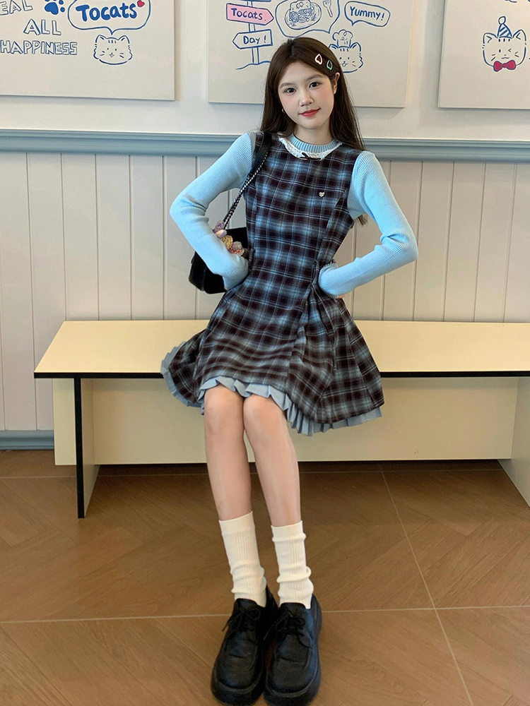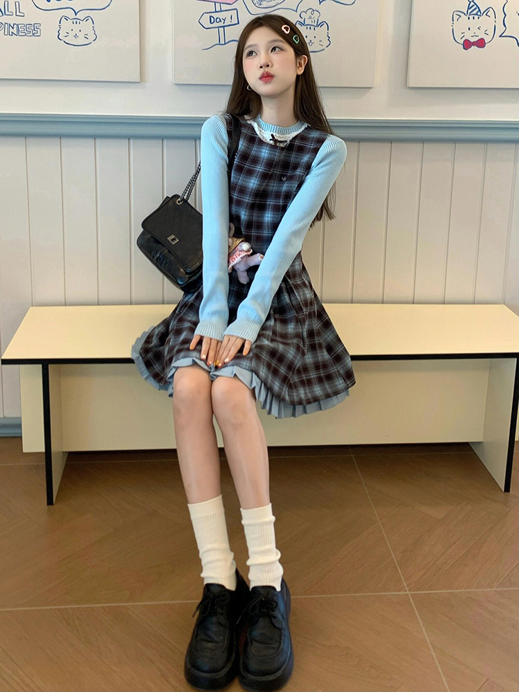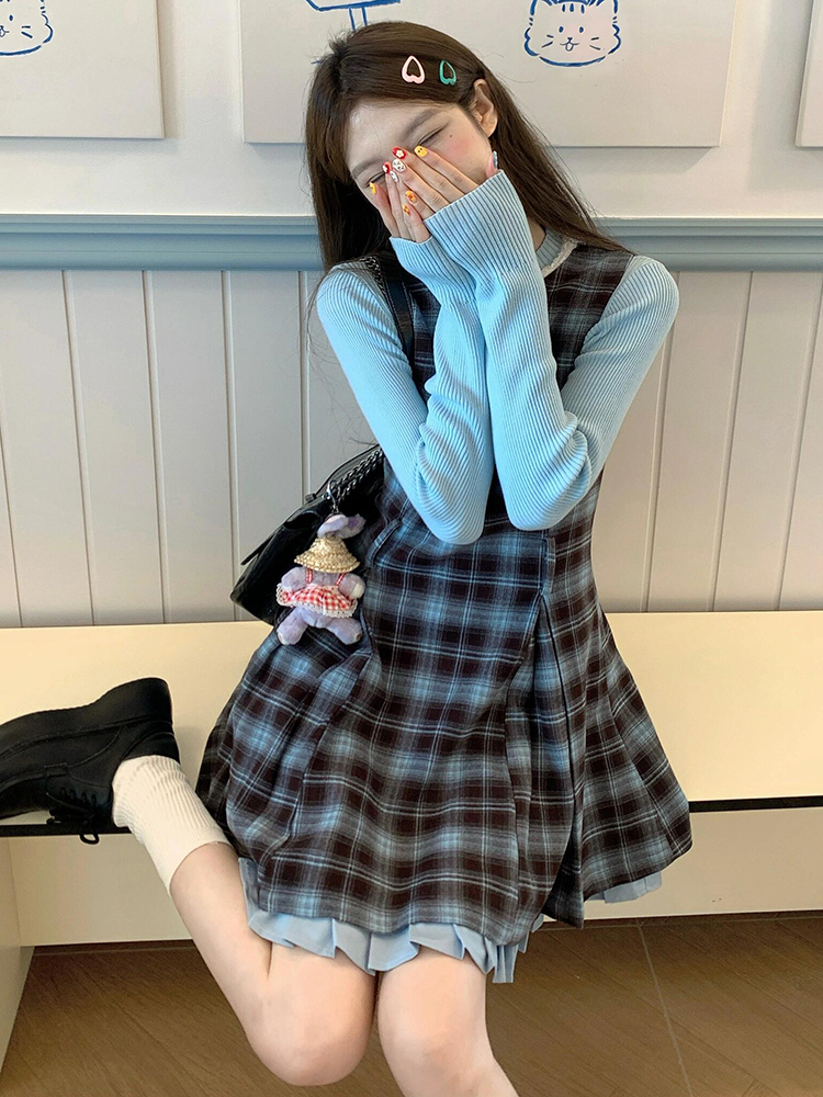 韩系学院风早秋穿搭套装2025新款小个子A字连衣裙chic甜辣两件套