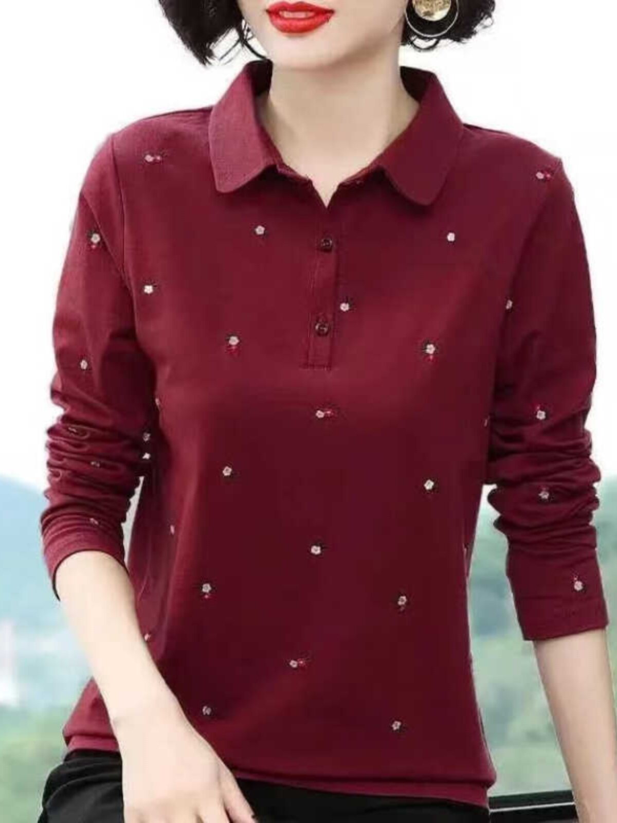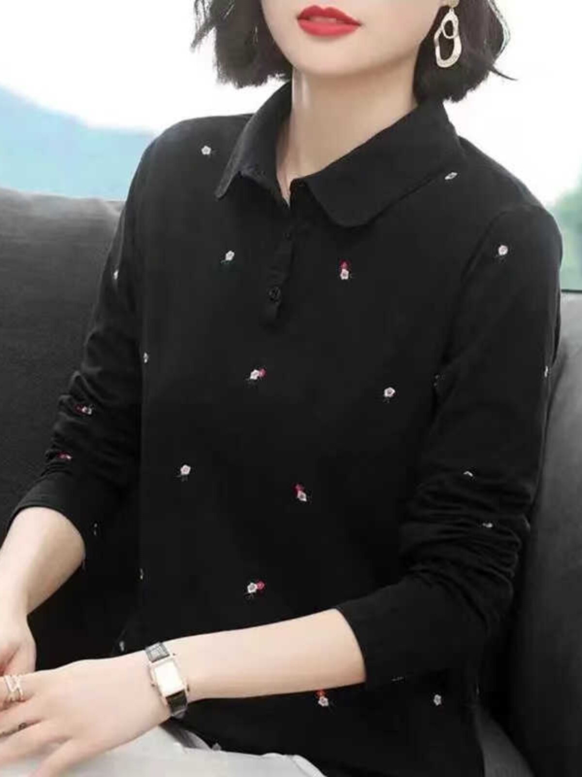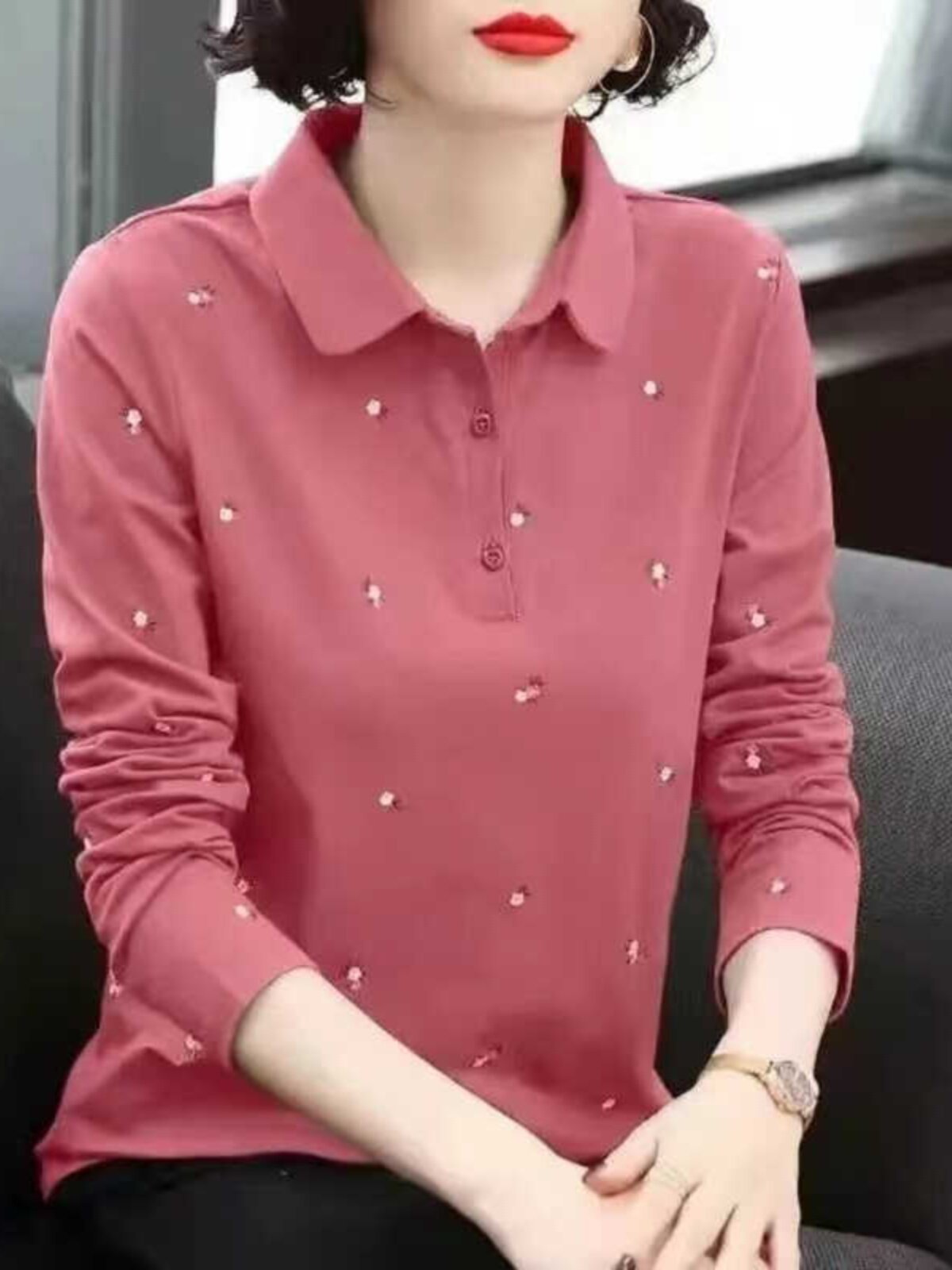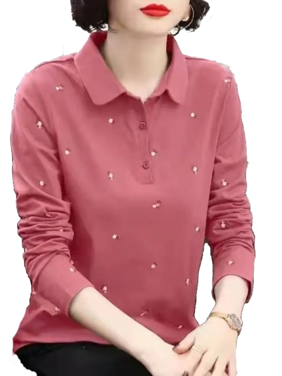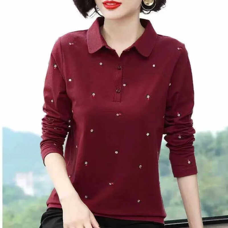 POLO衫长袖翻领T恤女秋冬季新款中年妈妈大码女装减龄百搭打底衫