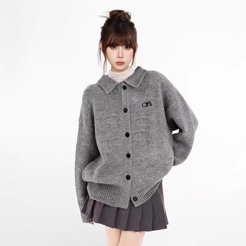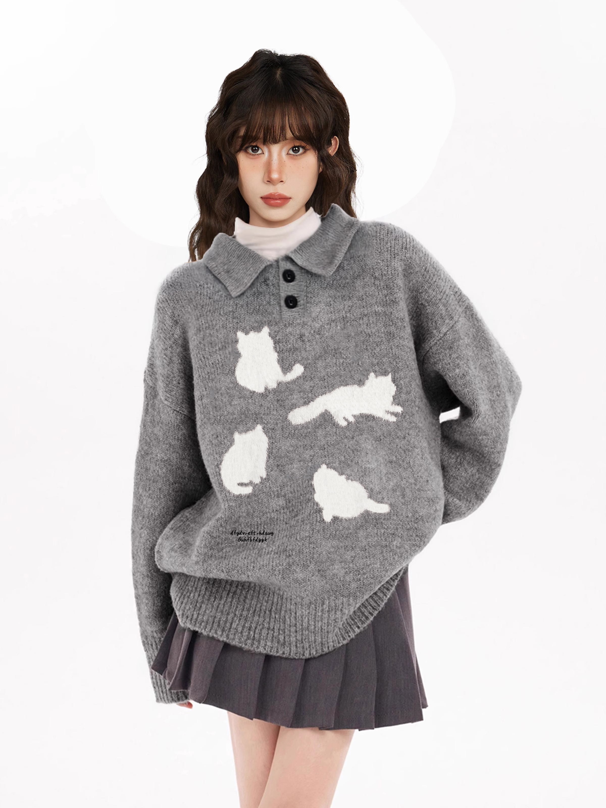 灰色POLO翻领猫咪套头毛衣女秋冬冬季加厚宽松慵懒羊毛针织衫外穿