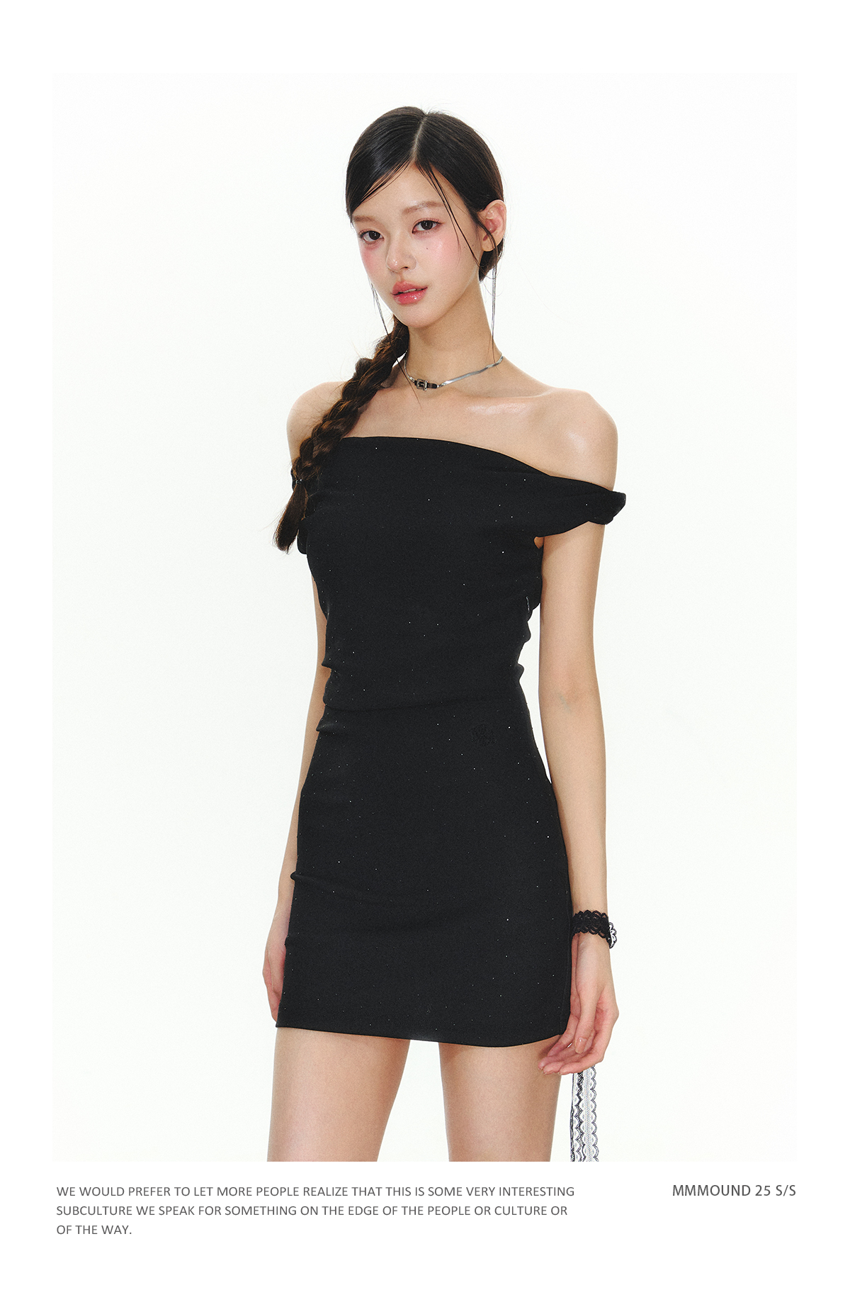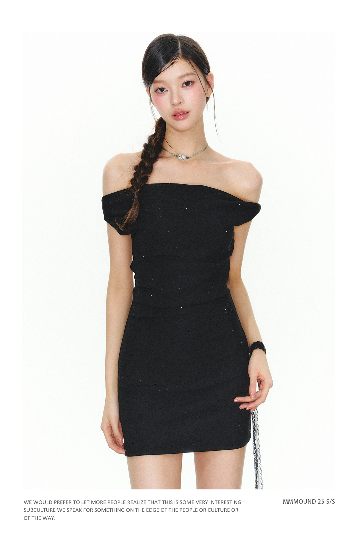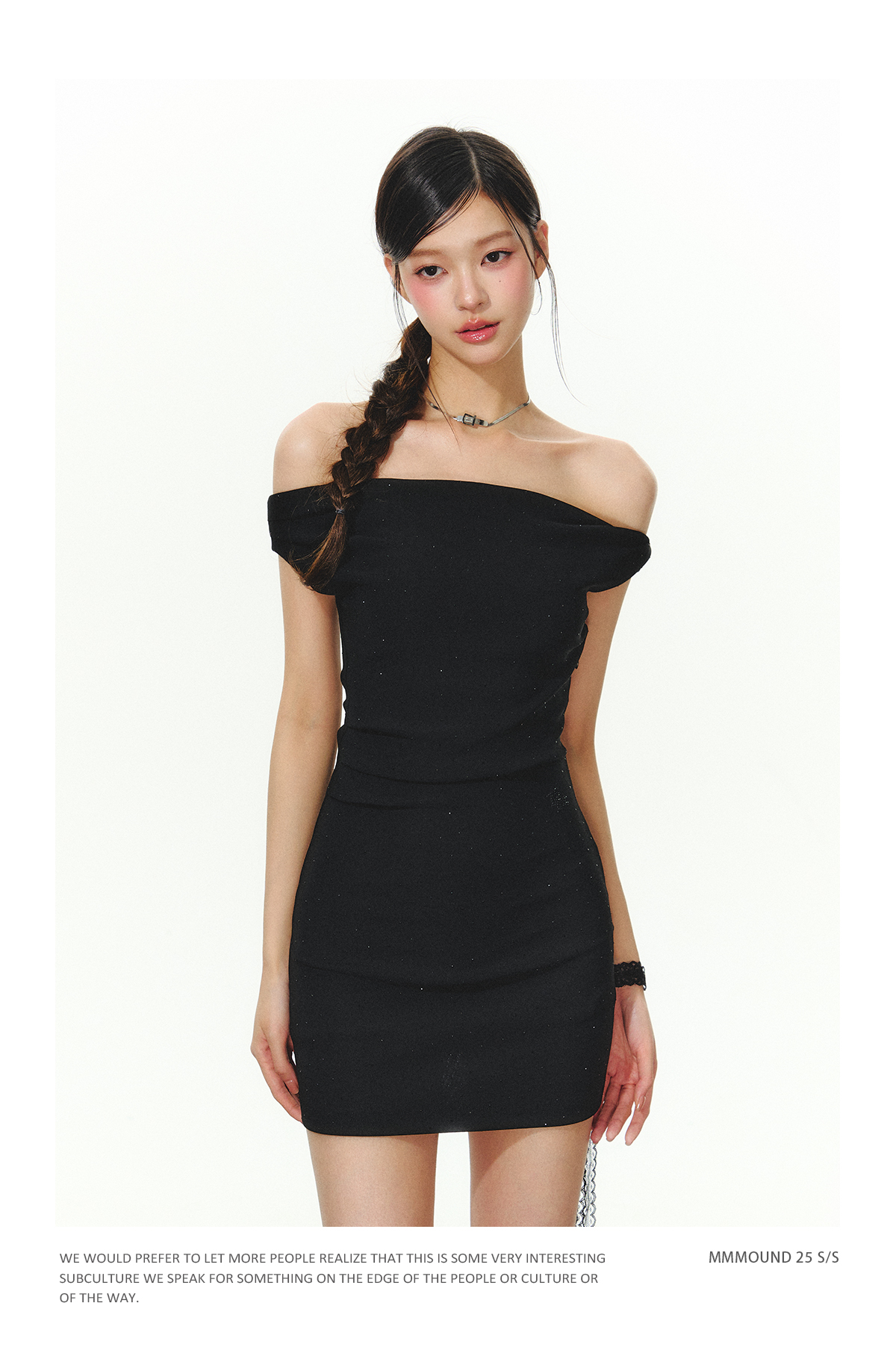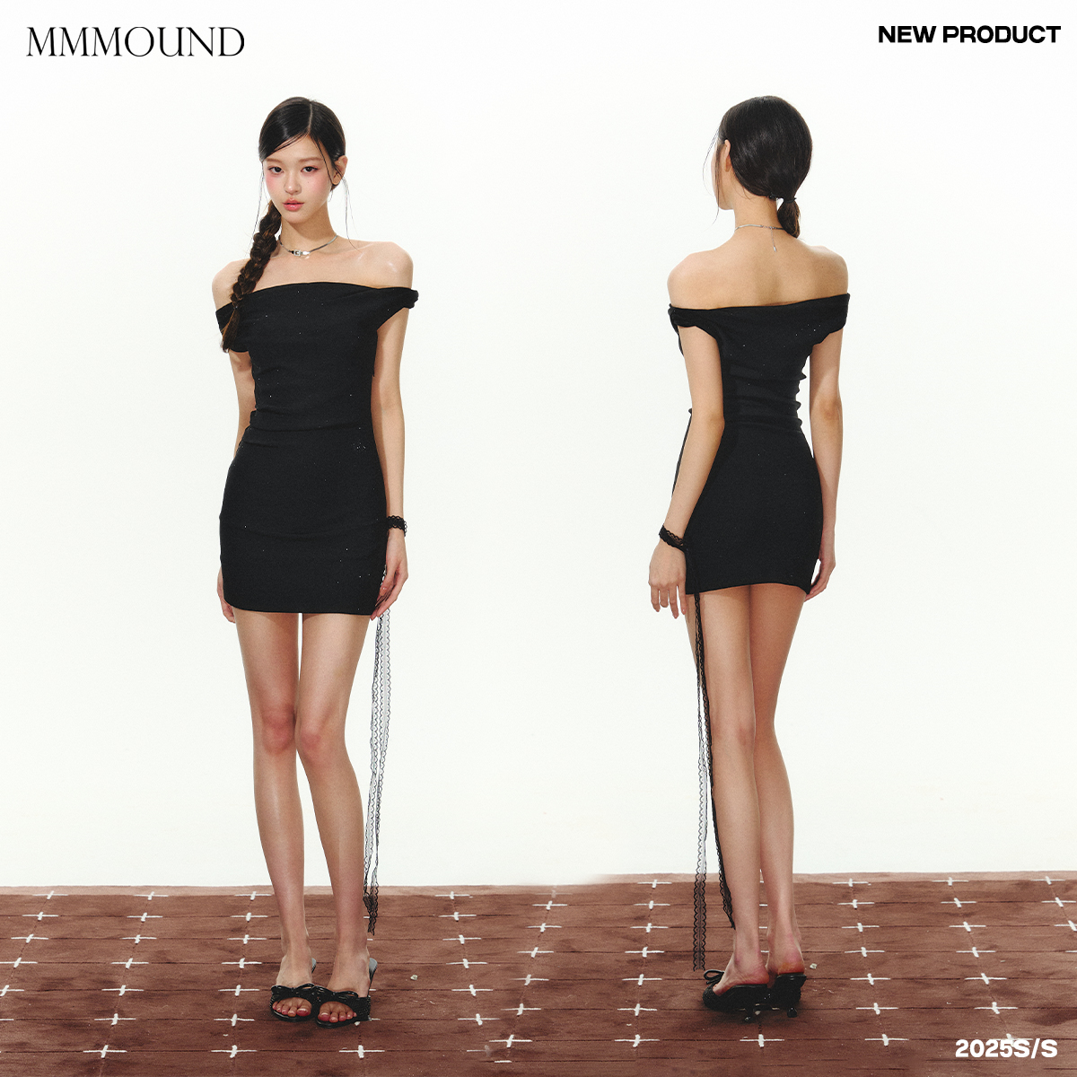 MMMOUND 一字肩连衣裙女夏季新款黑色收腰修身露肩裙子