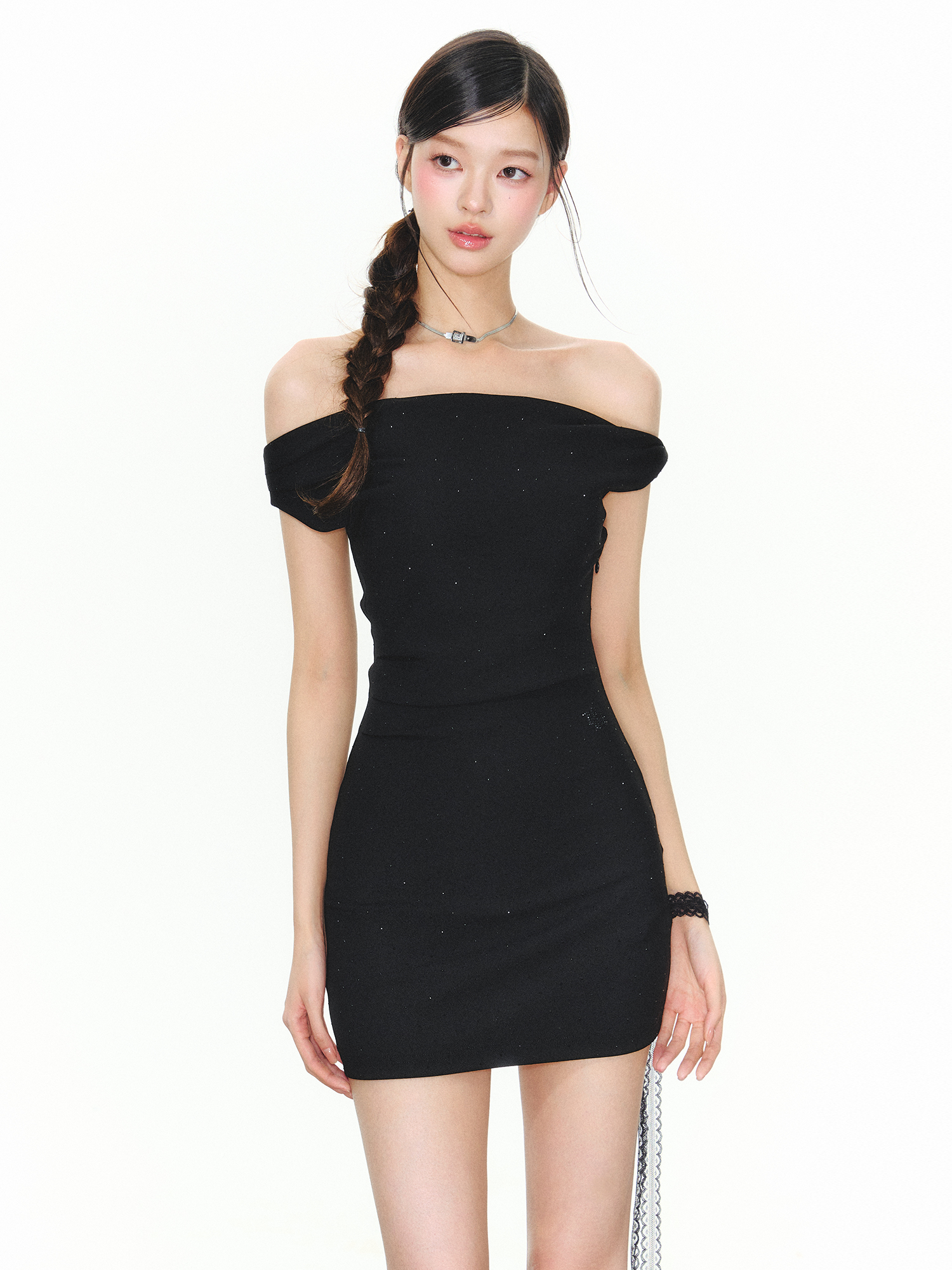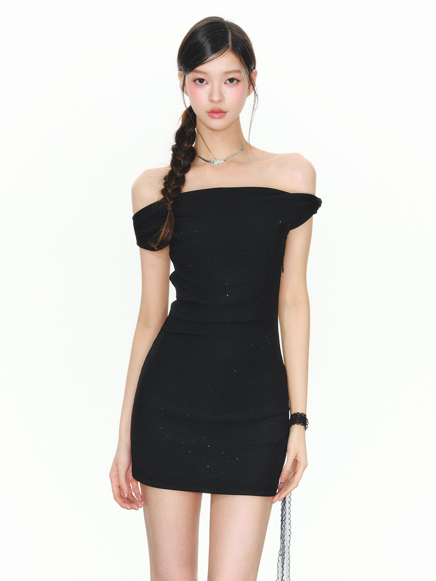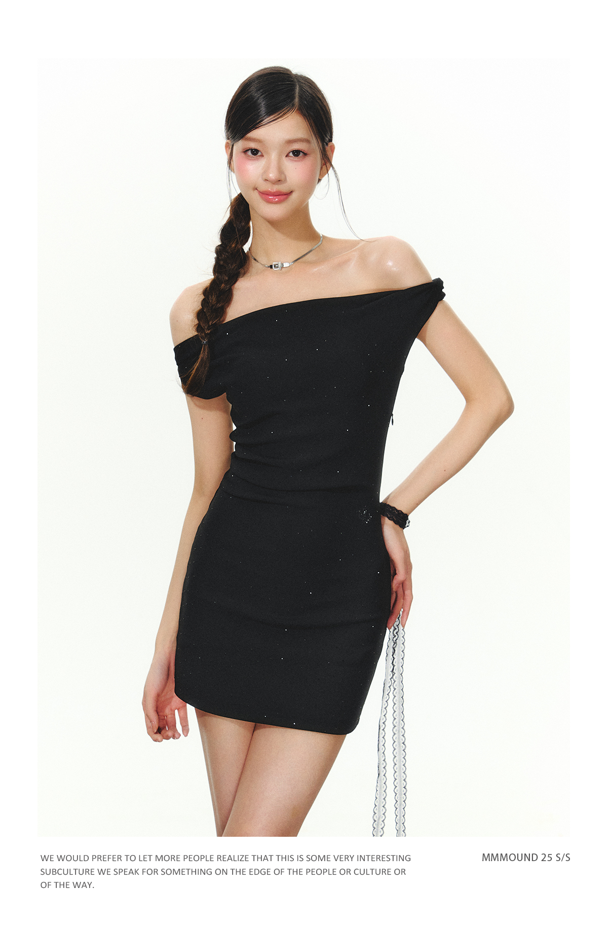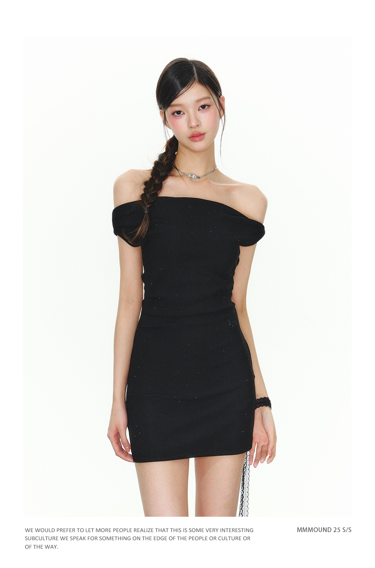 MMMOUND 一字肩连衣裙女夏季新款黑色收腰修身露肩裙子