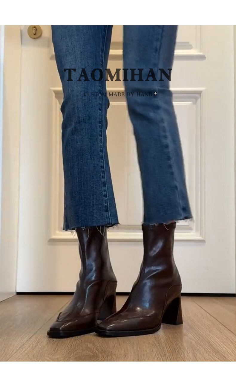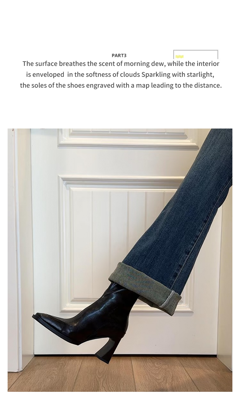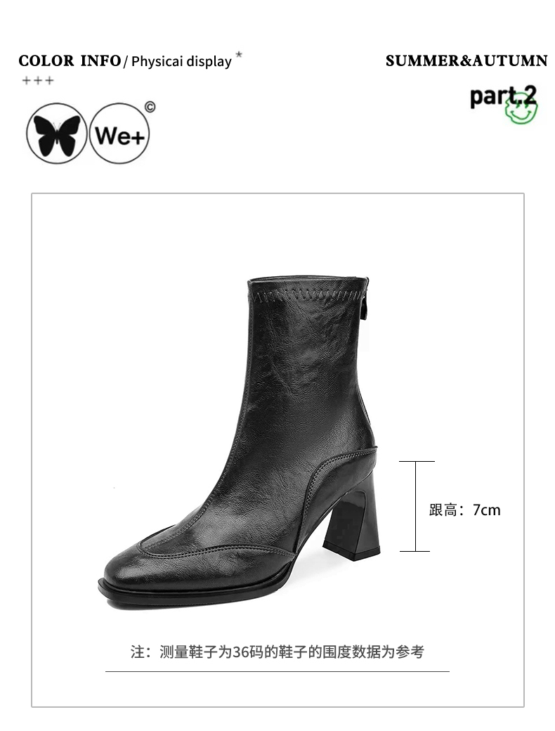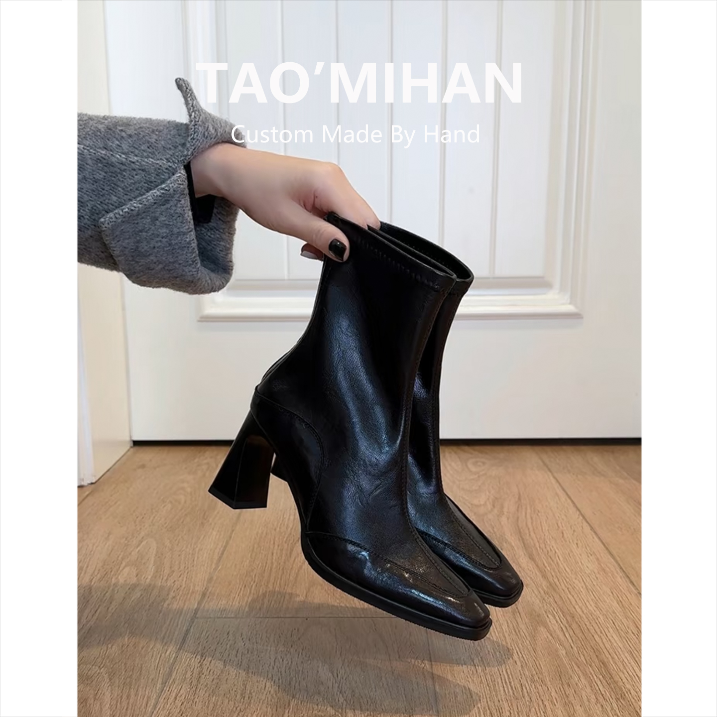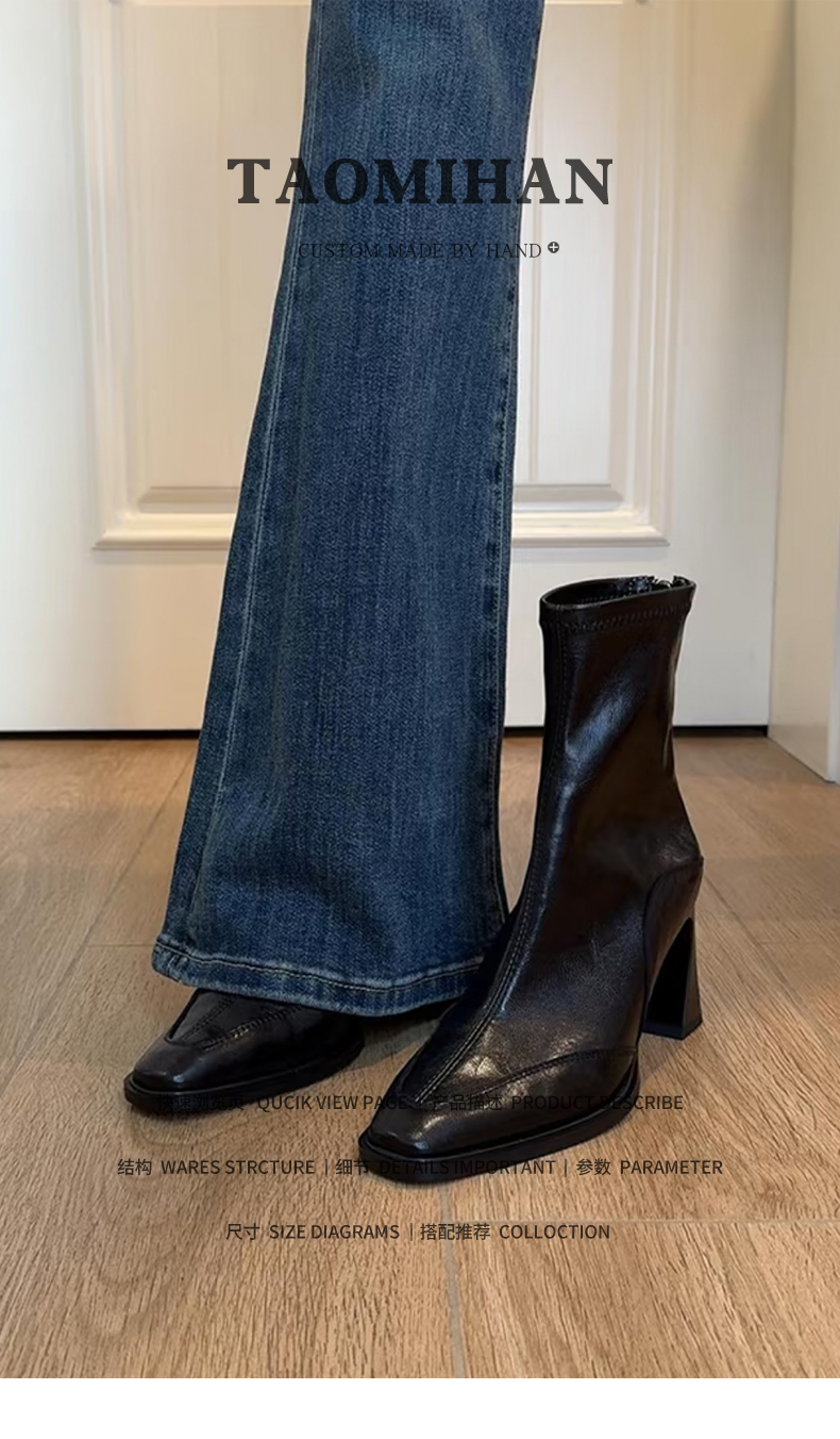 真皮高跟鞋短靴女2025秋冬季新款方头马丁靴黑色加绒粗跟瘦瘦靴子