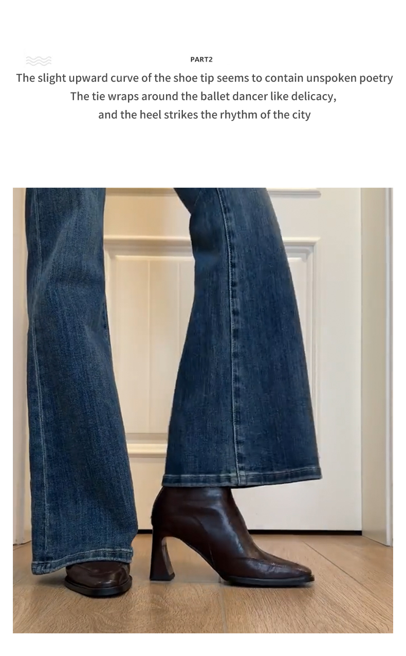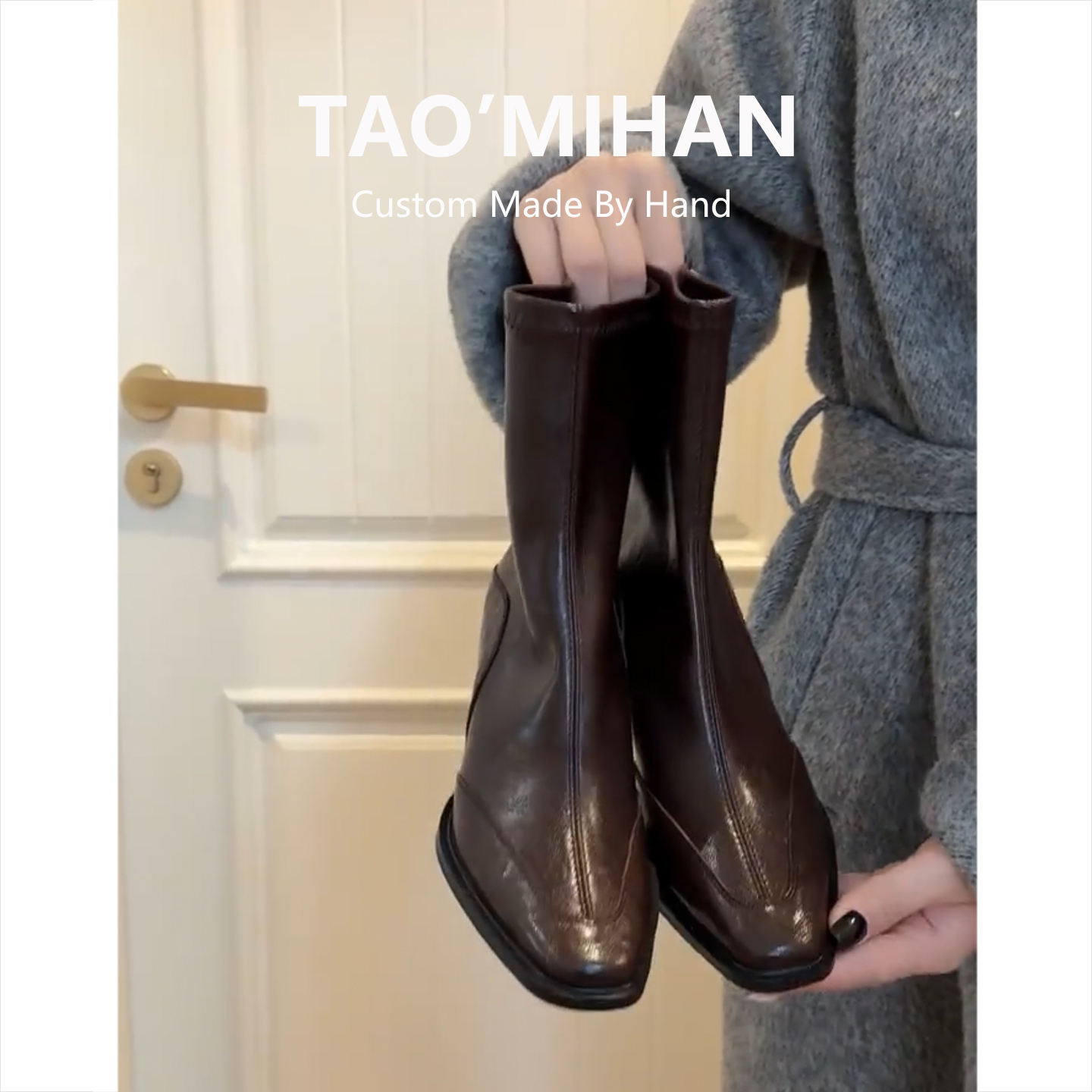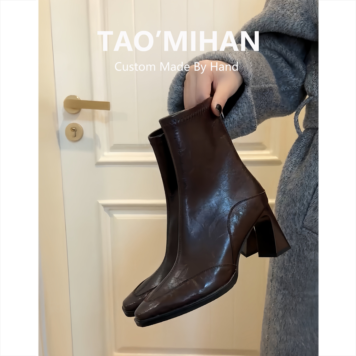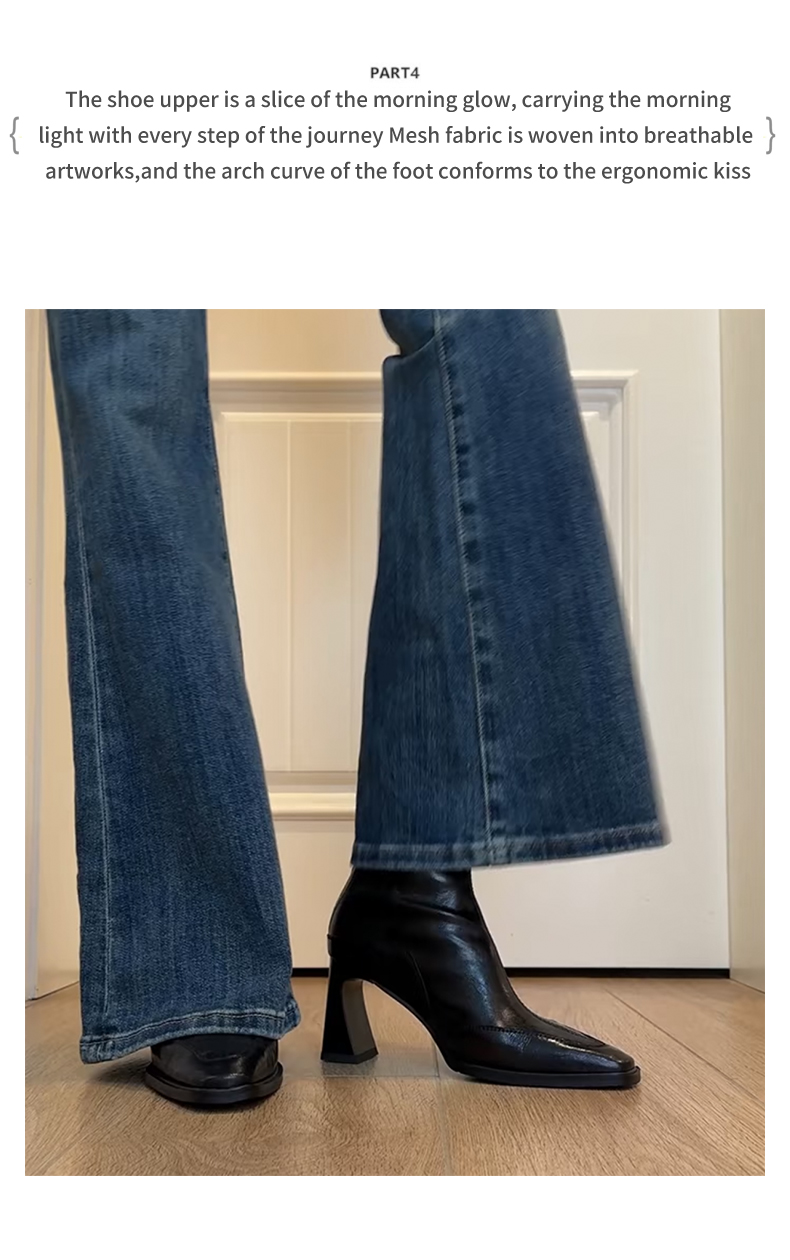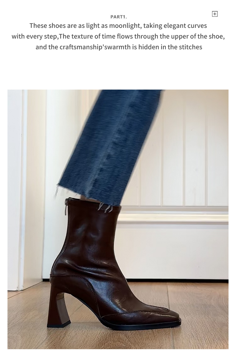 真皮高跟鞋短靴女2025秋冬季新款方头马丁靴黑色加绒粗跟瘦瘦靴子