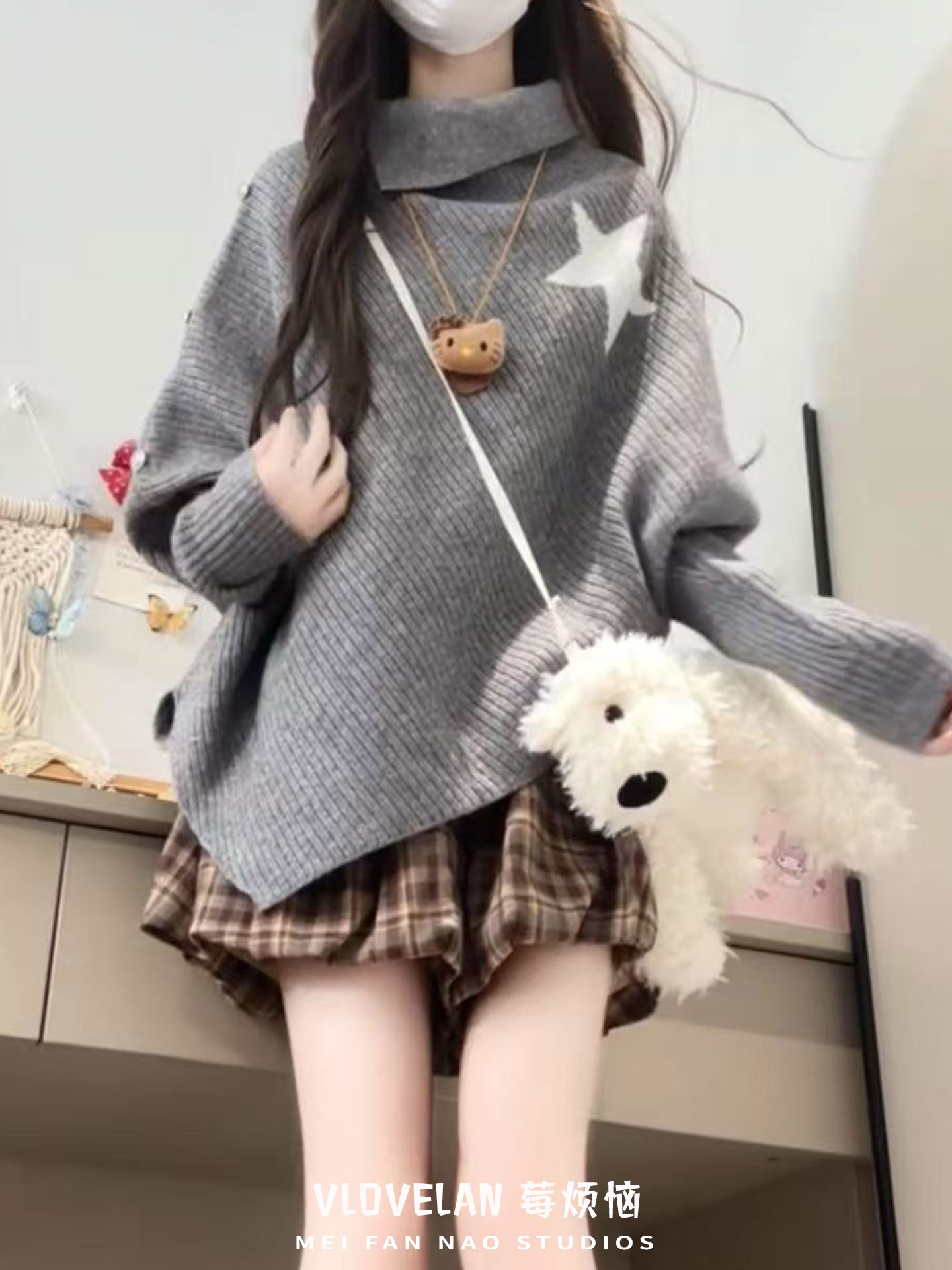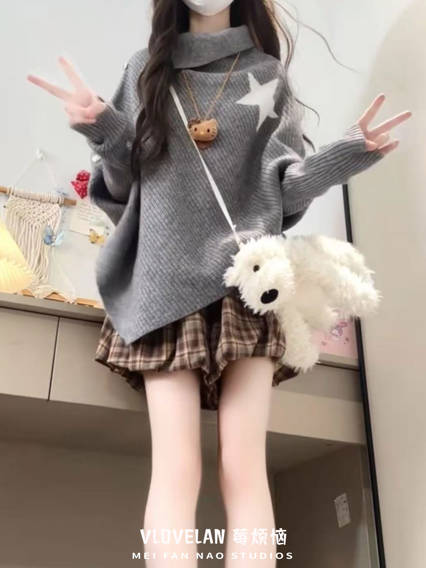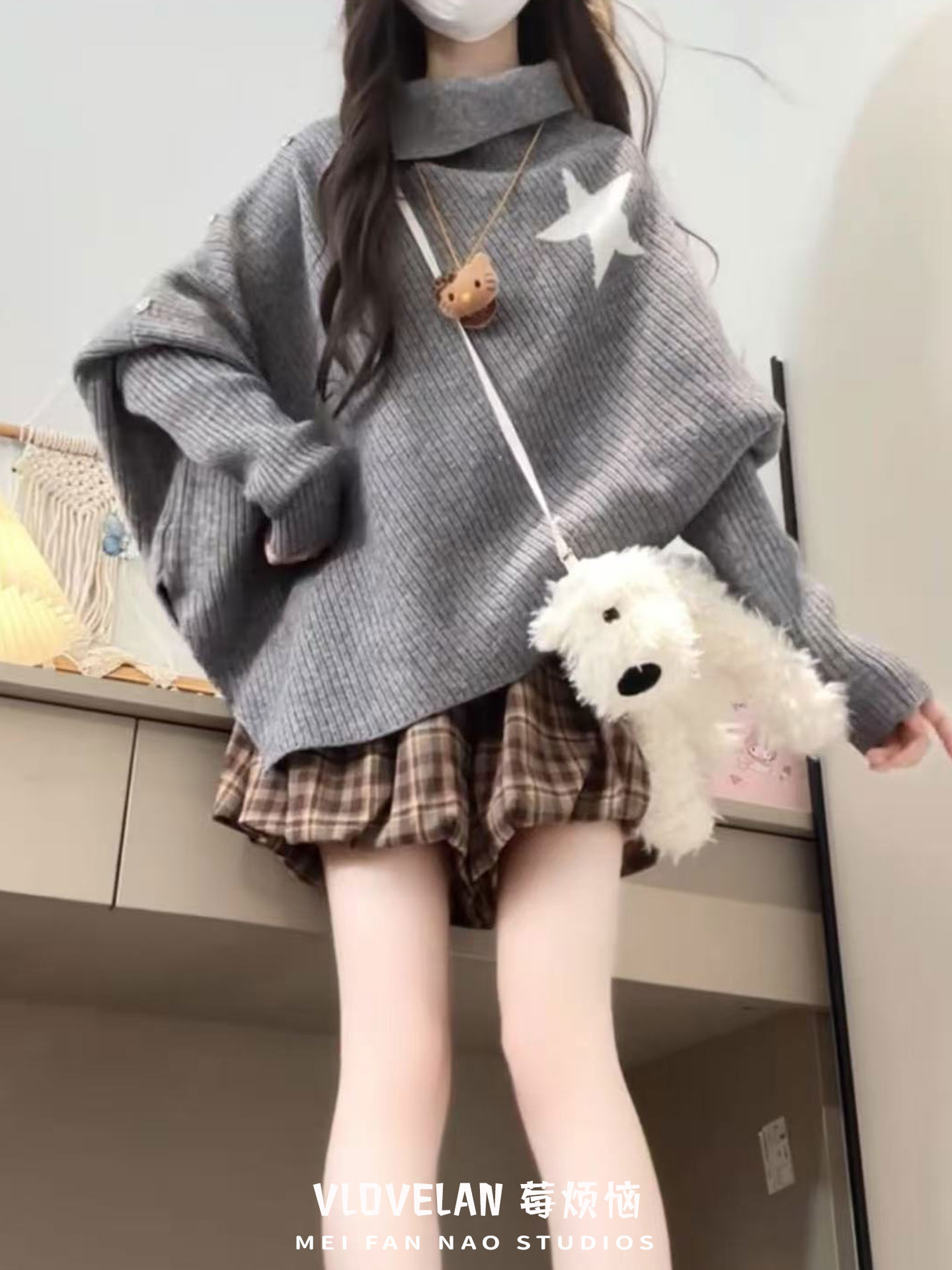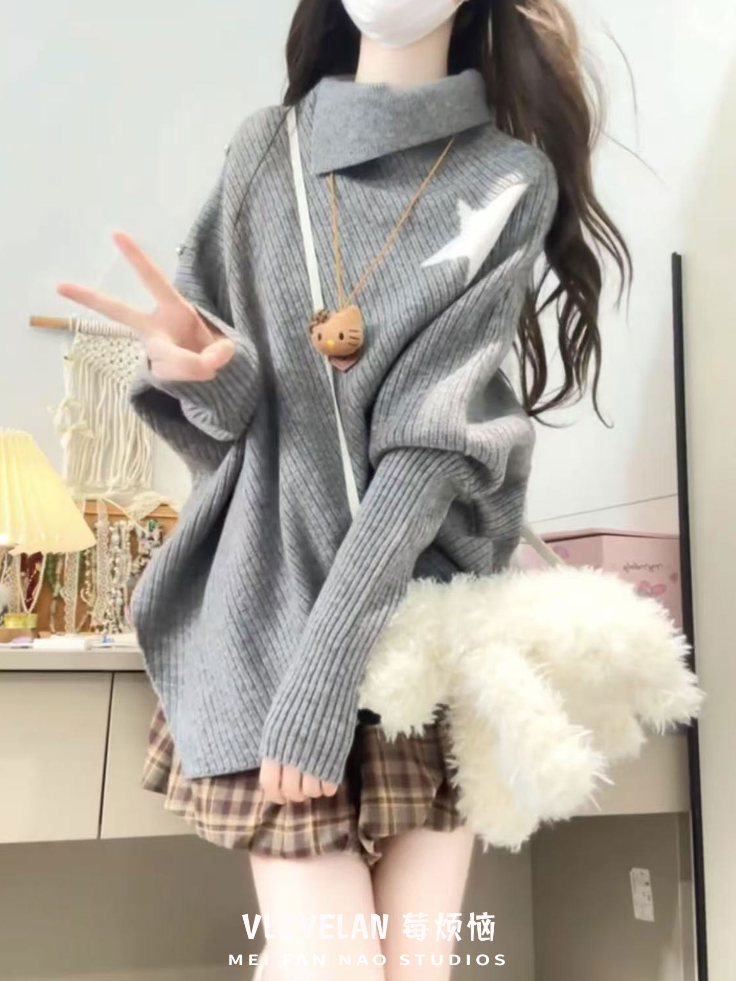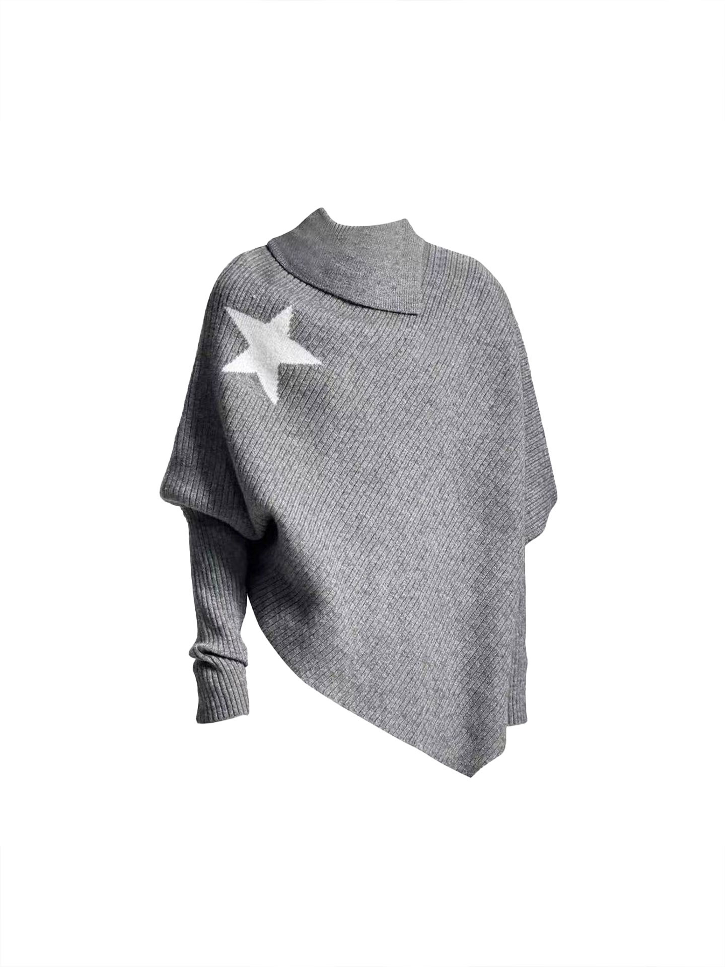 秋冬新款不规则设计感宽松小众斗篷刺绣高领星星毛衣披风针织衫女